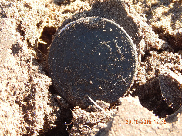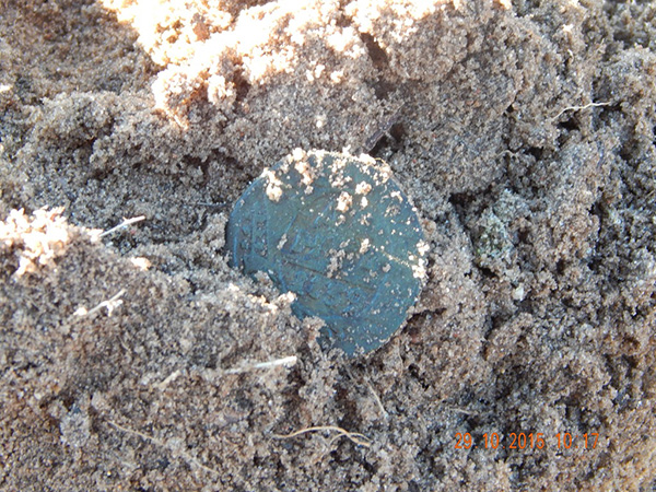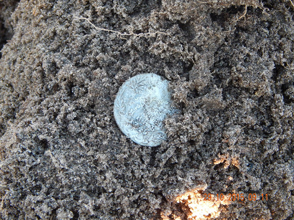 Бульдозера, как Вы видите, при мне нет. Впрочем как и супер-опережающей время поисковой техники тоже нет. Итак мы приступили в поиску кольцевика. Через некоторое время у Василия раздался сигнал, это оказалась деньга, день начинается хорошо. У меня по прежнему сигналов не было… Через некоторое время сигнал радовал уже меня, после небольших манипуляций, из глубины веков, свет увидела вот эта замечательная монета.